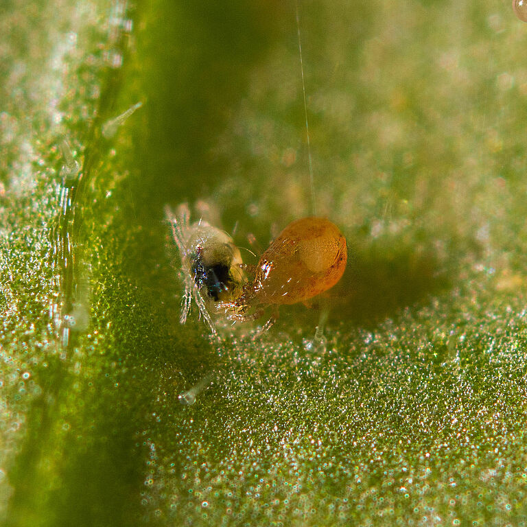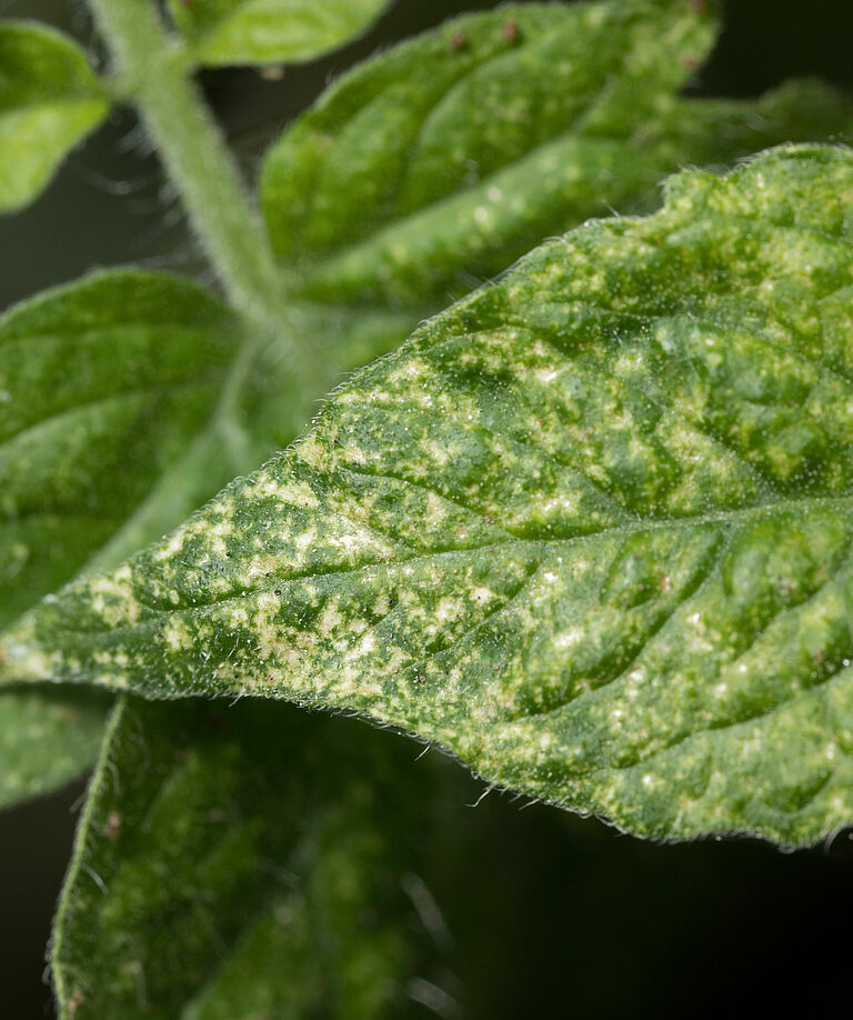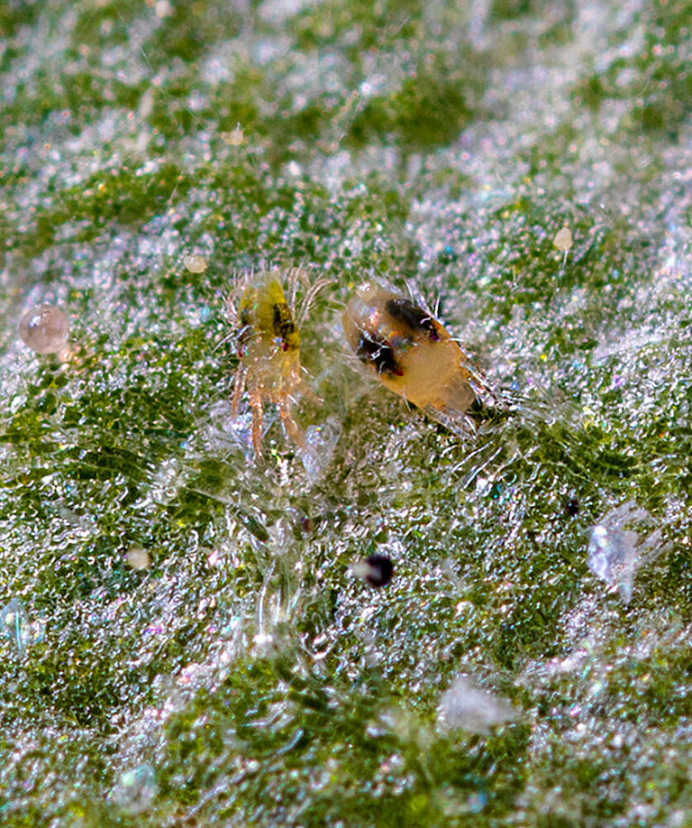Tetranychus urticae (araña roja o araña de dos puntos) es la especie más común en cultivos en invernadero y al aire libre. Estas plagas perforan las células de las plantas, provocando punteado, amarilleamiento de las hojas y, finalmente, necrosis. Los brotes pueden intensificarse rápidamente en condiciones cálidas y secas, lo que exige estrategias de control proactivas y eficaces.