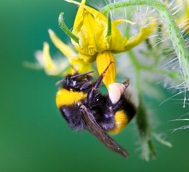 A la hora de polinizar, el abejorro se sujeta de la flor y la hace vibrar, a esto se le conoce como polinización por vibración o zumbido. Las marcas de sus mandíbulas sobre la flor (distinguidas por la decoloración que provocan) adquieren un color marrón pasadas de una a cuatro horas, permitiendo controlar la polinización y el trabajo de los abejorros. Una sola visita basta para suministrar el polen necesario para asegurar el cuaje del fruto.
