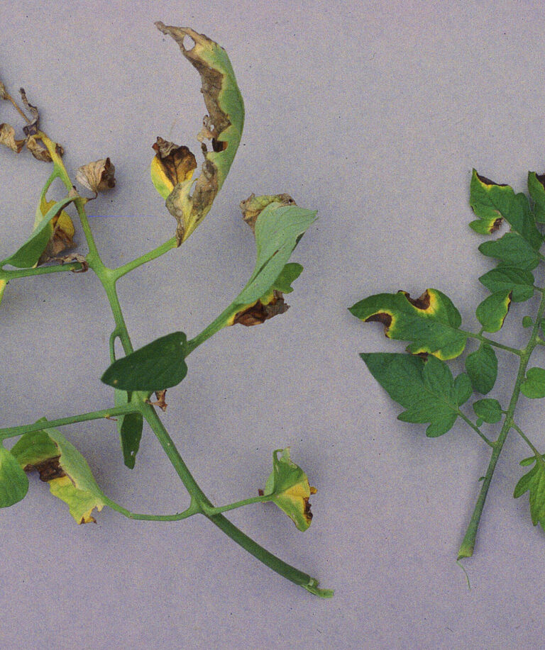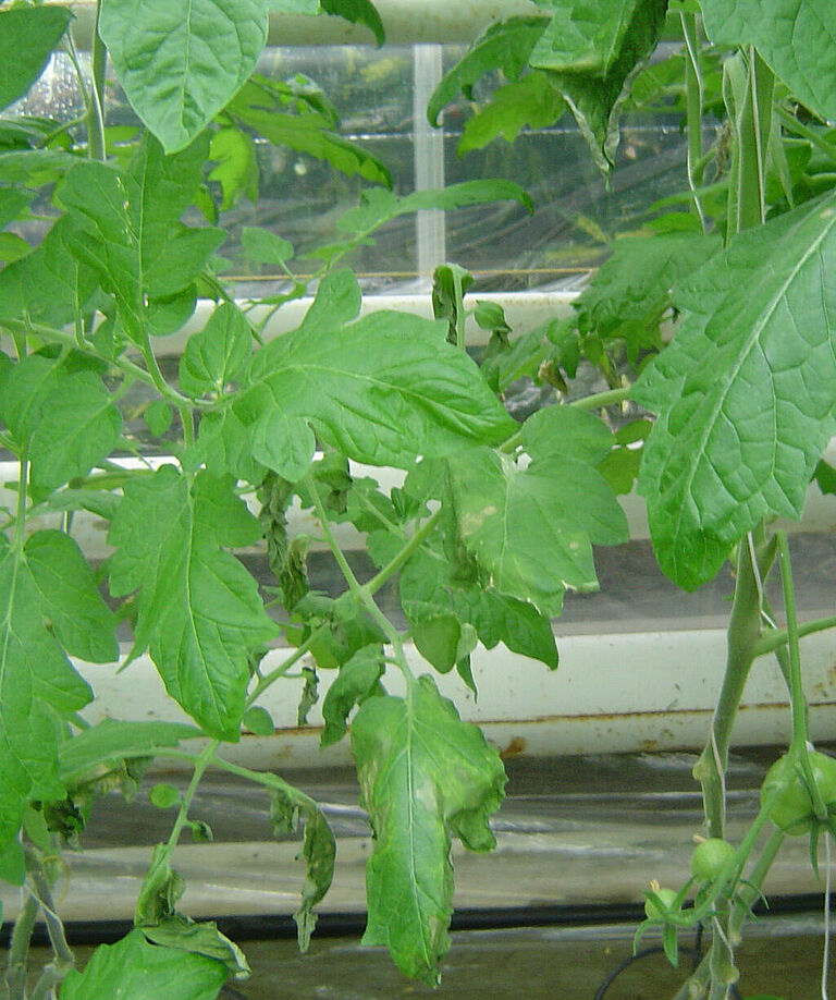 El Clavibacter causa manchas en tallos, hojas y frutos. Las hojas y los brotes marchitan se marchitan. En las hojas inferiores se observan lesiones blancas similares a ampollas que más tarde se vuelven marrones y pueden agruparse. Las hojas se enrollan hacia arriba, empezando normalmente por un lado de la planta, volviéndose marrones, pero sin caerse. En los tallos y brotes se forman rayas claras que se desgarran y facilitan la formación de úlceras. En las hojas de las tomateras, se observan lesiones llenas de agua, normalmente blancas con un centro marrón.