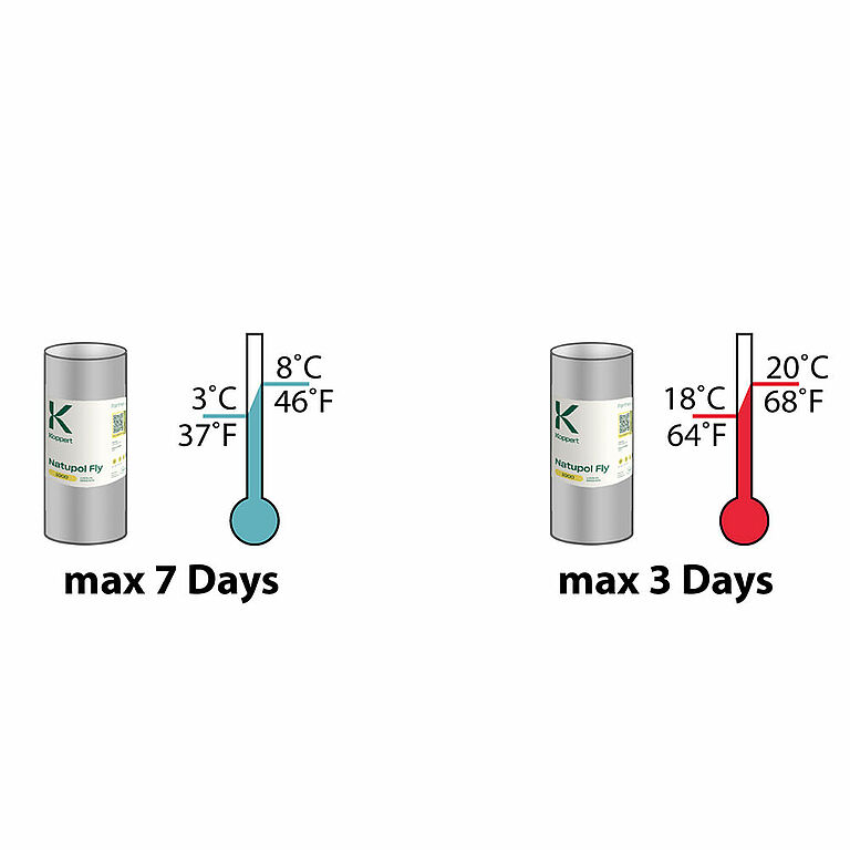 Si la temperatura es inferior a 15˚C, no deberá aplicar Natupol Fly sin unos preparativos previos, puesto que la emergencia de las moscas es impredecible y suele tardar más de una semana. Si va a aplicar Natupol Fly a una temperatura inferior a 15˚C, primero deberá dejarlo madurar en un entorno cálido. Natupol Fly se deberá introducir en el cultivo después de que emerjan las primeras moscas adultas.