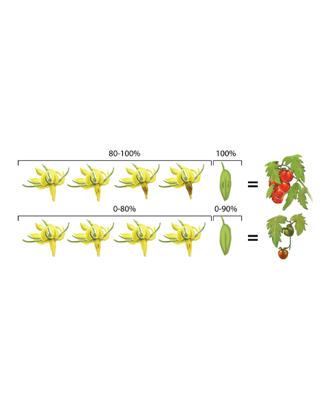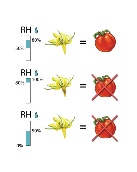 La condición idónea para la liberación del polen es cuando hay una humedad relativa (HR) de entre 50 y 80% . Por encima del 80-85% de HR, el polen no se liberará y los abejorros detendrán su actividad. Por debajo del 50% de HR, disminuirá la capacidad de germinación del polen y se dificultará el cuajado del fruto. Los abejorros seguirán recogiendo polen y dejando marcas de decoloración, pero no crecerán frutos.