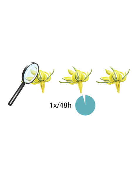 La polinización se debe producir antes de que la flor se cierre. Dependiendo de las condiciones, las flores suelen permanecer abiertas entre uno y tres días. Para monitorear la polinización, debes de recoger unas veinte flores cerradas en distintos lugares del cultivo. Todas las flores deberán presentar marcas de decoloración. Las flores cerradas ofrecen una imagen fiel de la situación real. Las flores que permanecen abiertas más de un día, presentan entre una y cinco marcas de decoloración.