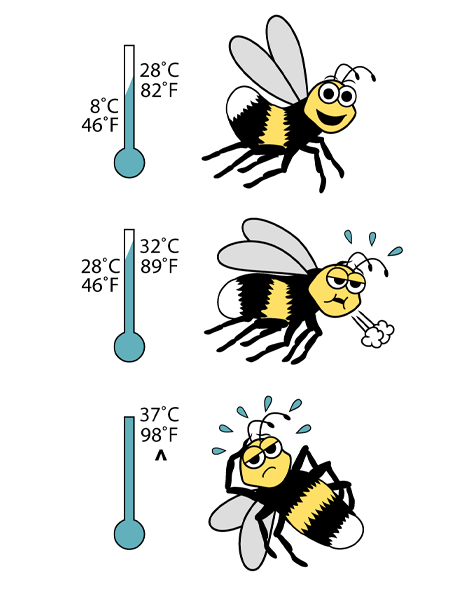 Los abejorros permanecen activos en un rango de temperatura de entre los 8 y los 32 grados centígrados. Su actividad es óptima entre los 8 y los 28 grados centígrados. A temperaturas entre 28 y 32 grados centígrados, disminuirá lentamente su actividad. Si la temperatura es superior, los abejorros dejarán de volar. Si esto pasa, los abejorros enfriarán la colonia, por medio de un aleteo constante, hasta que la temperatura vuelva a descender por debajo de los 32 grados centígrados.