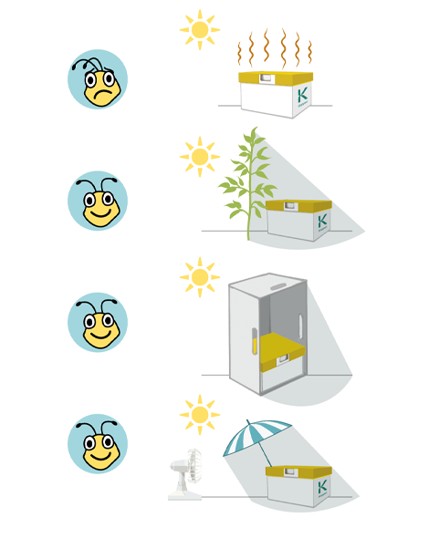 Los abejorros mantienen una temperatura constante dentro de la colmena, si se exponen a temperaturas altas por periodos prolongados, la colmena y la colonia pueden sufrir afectaciones. Si esto ocurre, mueve la colmena de abejorros al lugar más fresco disponible o a ponlas en la sombra, al menos en las horas más críticas. La sombra puede ser la que se forma de manera natural con el cultivo o con algún material improvisado, o alguna otra pantalla o método de sombreo artificial. De forma contraria, si estás en un periódo prolongado sin luz natural (como ocurre en meses invernales en algunas regiones del mundo) asegúrate de que la colmena reciba algo luz natural. Si existen periodos prolongados de temperaturas extremas (frías o calientes) debes de tomar medidas permanentes. Consulta a un asesor Koppert.