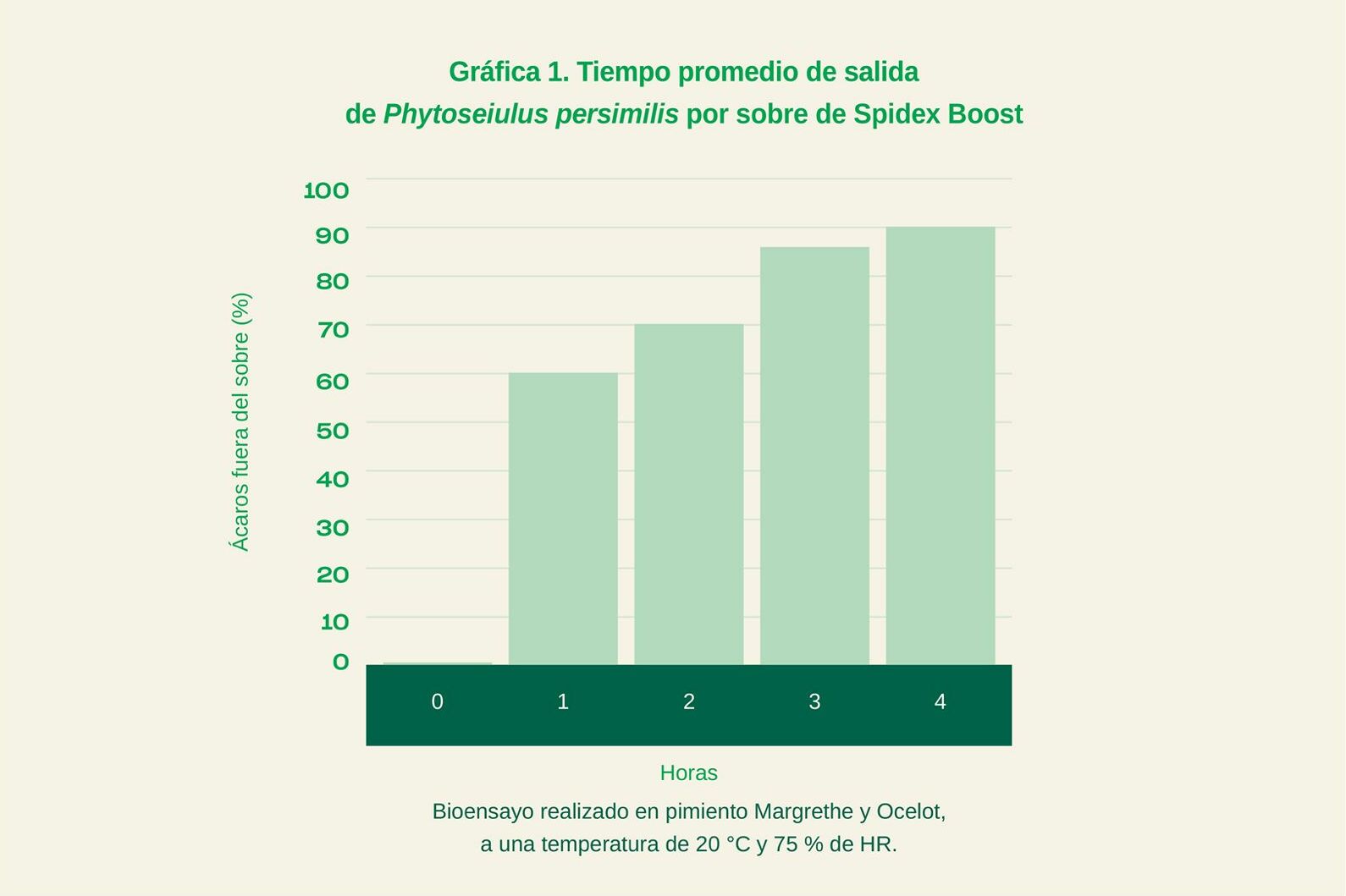 Spidex Boost se puede colgar en las plantas afectadas por la araña roja para darle al área una alta dosis de ácaros depredadores, ocasionando un impulso instantáneo en la población de benéficos. Tan pronto los sobres son abiertos, realizando una pequeña incisión en ellos, y colocados dentro del cultivo, los ácaros depredadores harán su trabajo (gráfica 1) y reducirán considerablemente las infestaciones de araña roja.