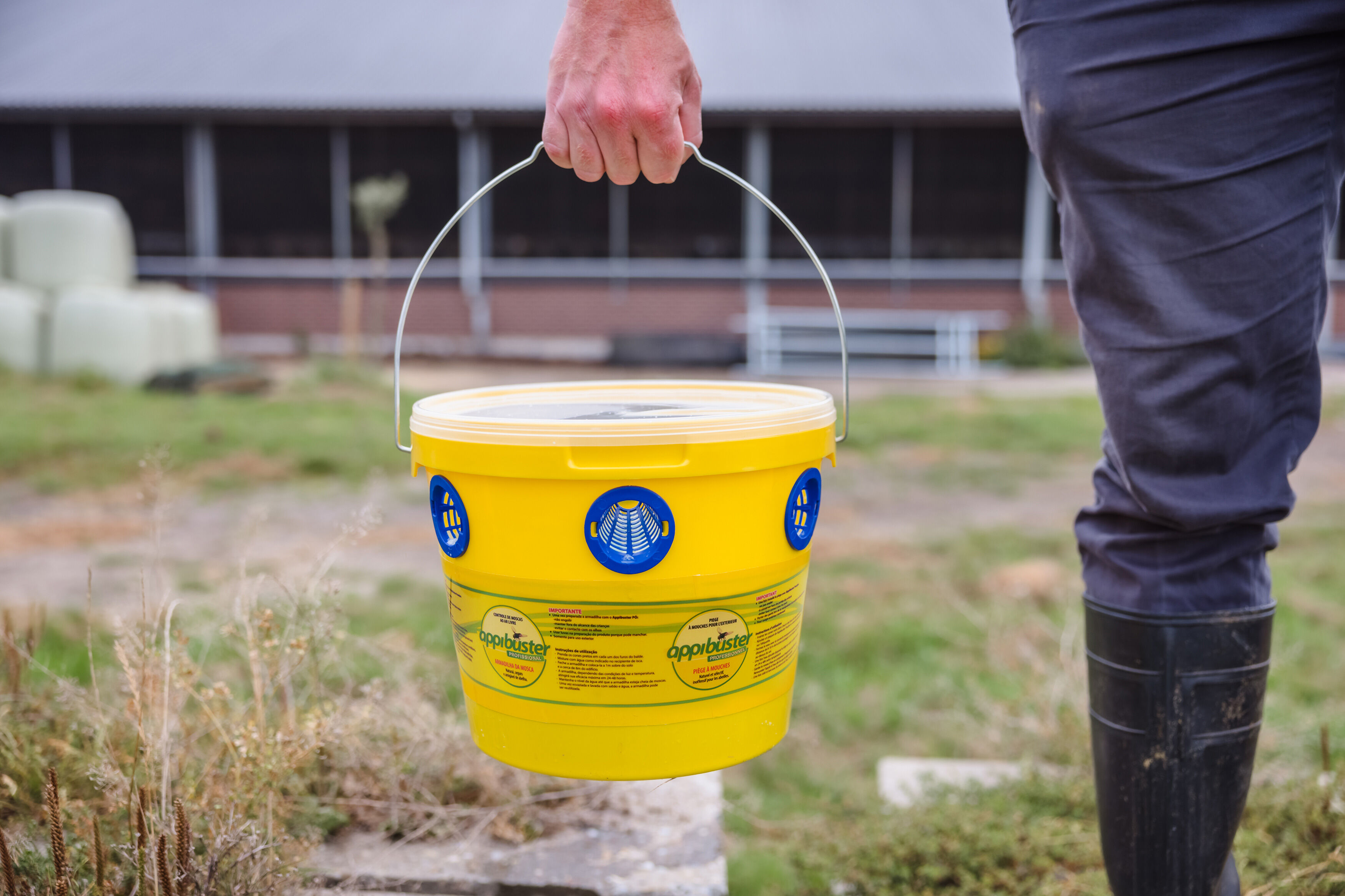 Primero, para evitar la entrada de poblaciones migrantes de moscas a tus instalaciones puedes colocar una barrera biológica que proteja el perímetro exterior. Esto lo puedes lograr colocando nuestro sistema de trampeo Appibuster, una herramienta con un cebo atrayente para la captura masiva de diversos tipos de moscas presentes en explotaciones pecuarias.