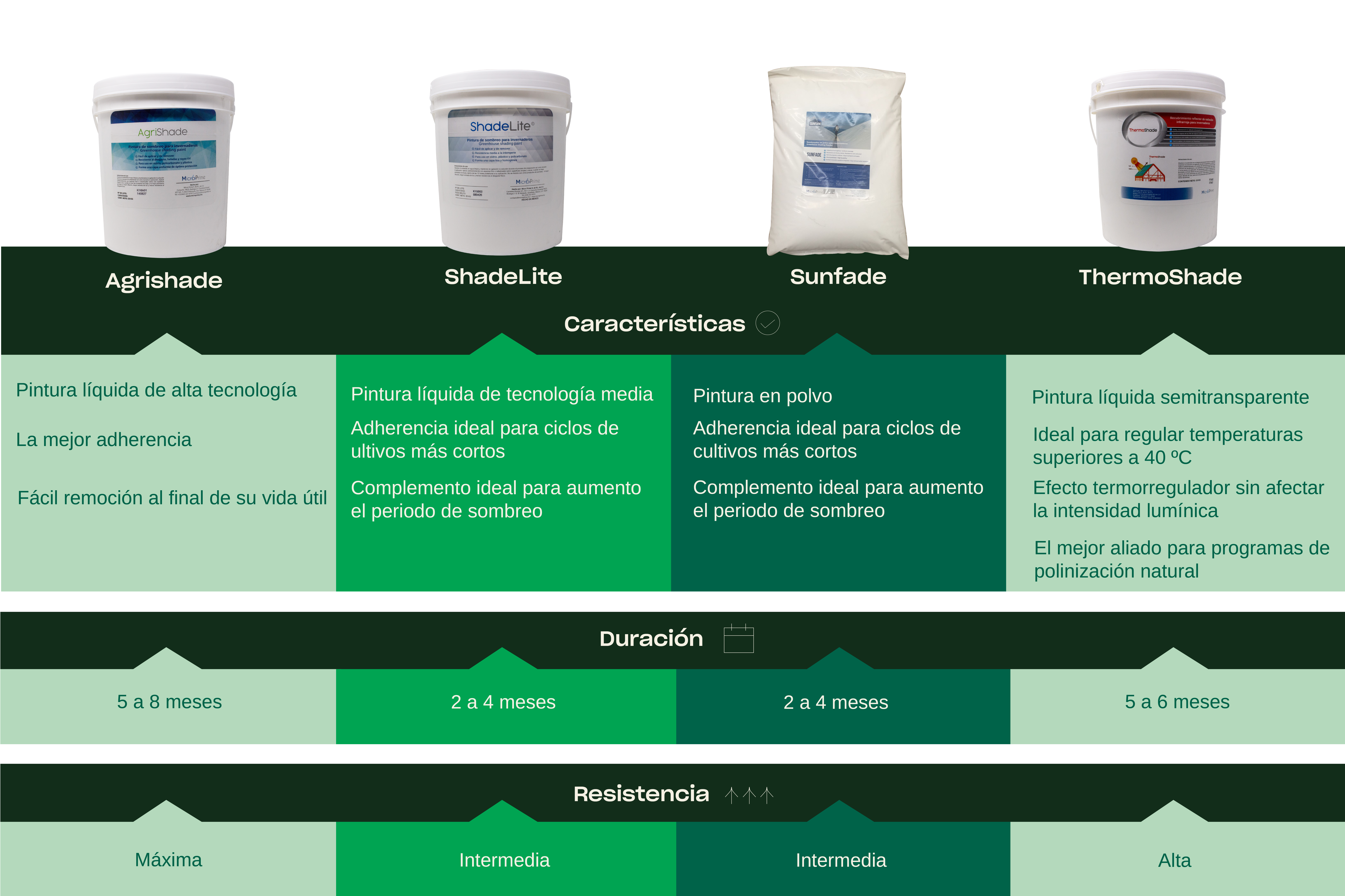 Koppert ofrece una línea de productos para sombreo que se adaptan a distintas necesidades y presupuestos. Con distintas duraciones, niveles de resistencia y beneficios adicionales, estos recubrimientos ayudan a mantener un ambiente óptimo en tu invernadero. A continuación, un resumen de sus principales características: