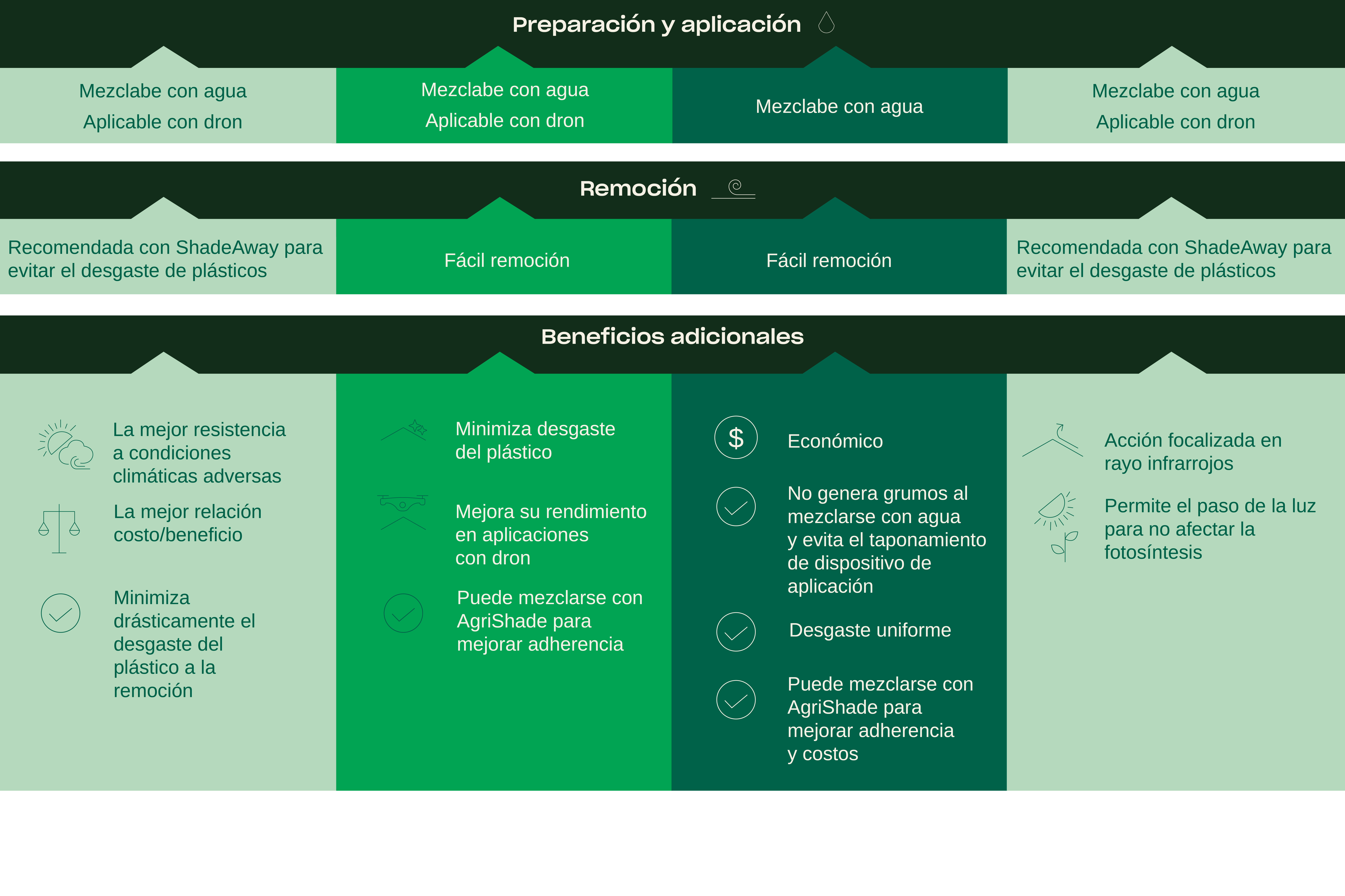 Todos estos productos son mezclables con agua y, en la mayoría de los casos, pueden ser aplicados mediante dron, facilitando su uso en grandes extensiones. Además, se recomienda la remoción con ShadeAway para evitar el desgaste de plásticos en los invernaderos.