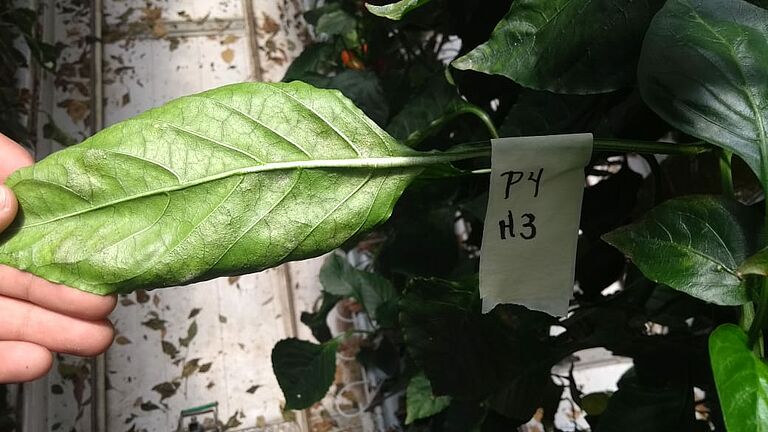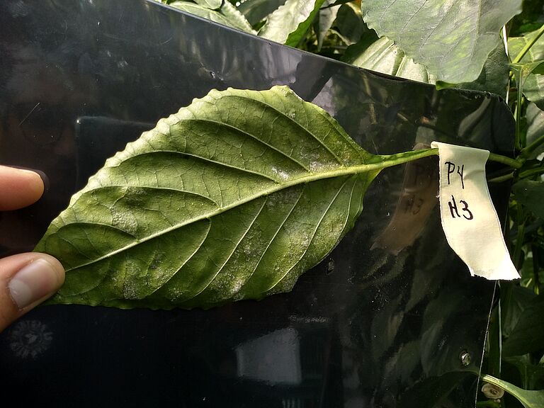 Imagen 1. Presencia de cenicilla en hoja de pimiento, previo a la aplicación de Enzicur.