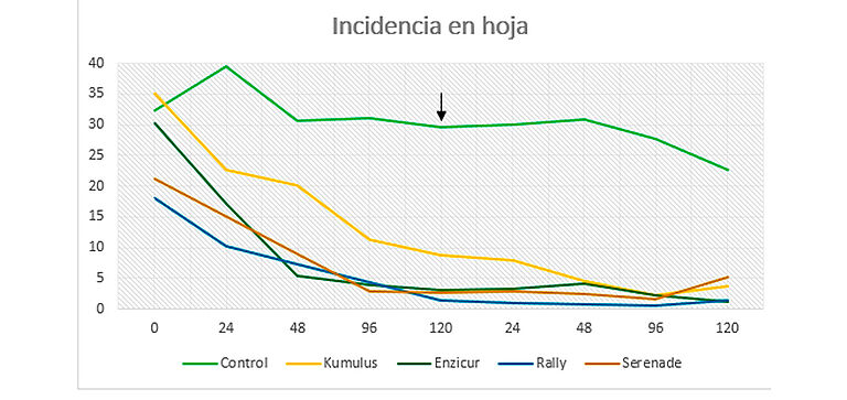 Gráfica 1. Porcentaje de incidencia de cenicilla en hoja después de la aplicación de diferentes productos comerciales en pimiento. La flecha indica la segunda aplicación.