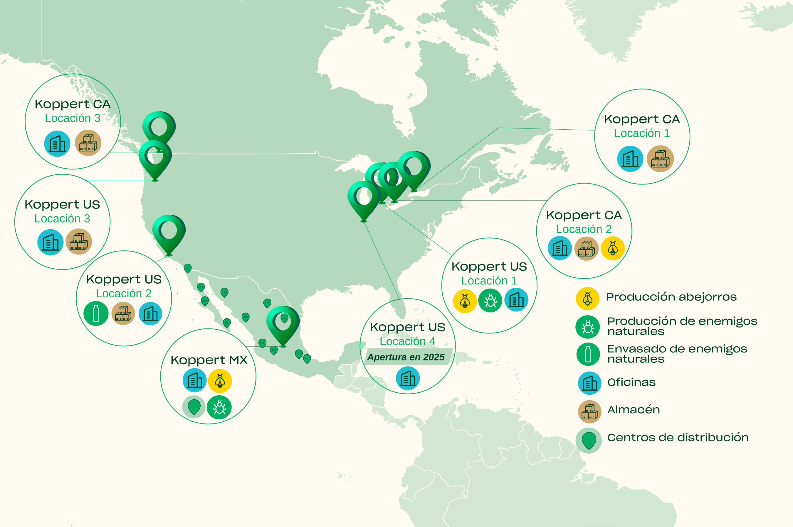 Desde hace algunos años, Koppert inició también con la producción de diferentes especies de enemigos naturales para el control de las principales plagas presentes en esta región del mundo. Estas bio-fábricas están ubicadas en California y Michigan, EE. UU., y Querétaro, México; y permiten ampliar la capacidad de producción, envasado y distribución de insectos y ácaros depredadores y avispas parasitoides, en el clúster norteamericano.