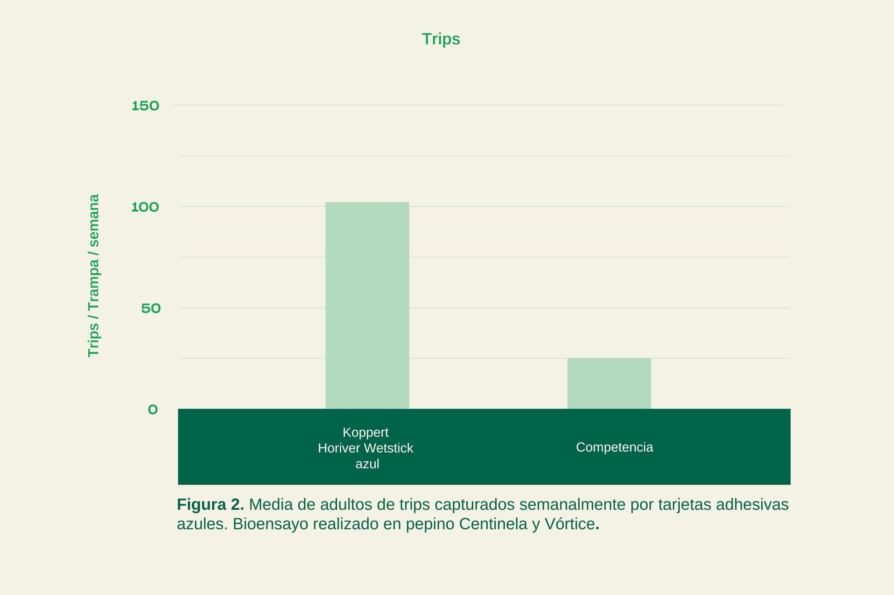 Además de esta prueba, realizamos otra en un invernadero de pimiento, en la que se contabilizaron trips capturados en dos trampas color azul de la competencia y se compararon contra el número de trips en una trampa Horiver Wetstick azul de Koppert. El resultado fue que, en las trampas de la competencia solo se encontró un 38% del total de adultos capturados en una sola trampa adhesiva azul de Koppert.