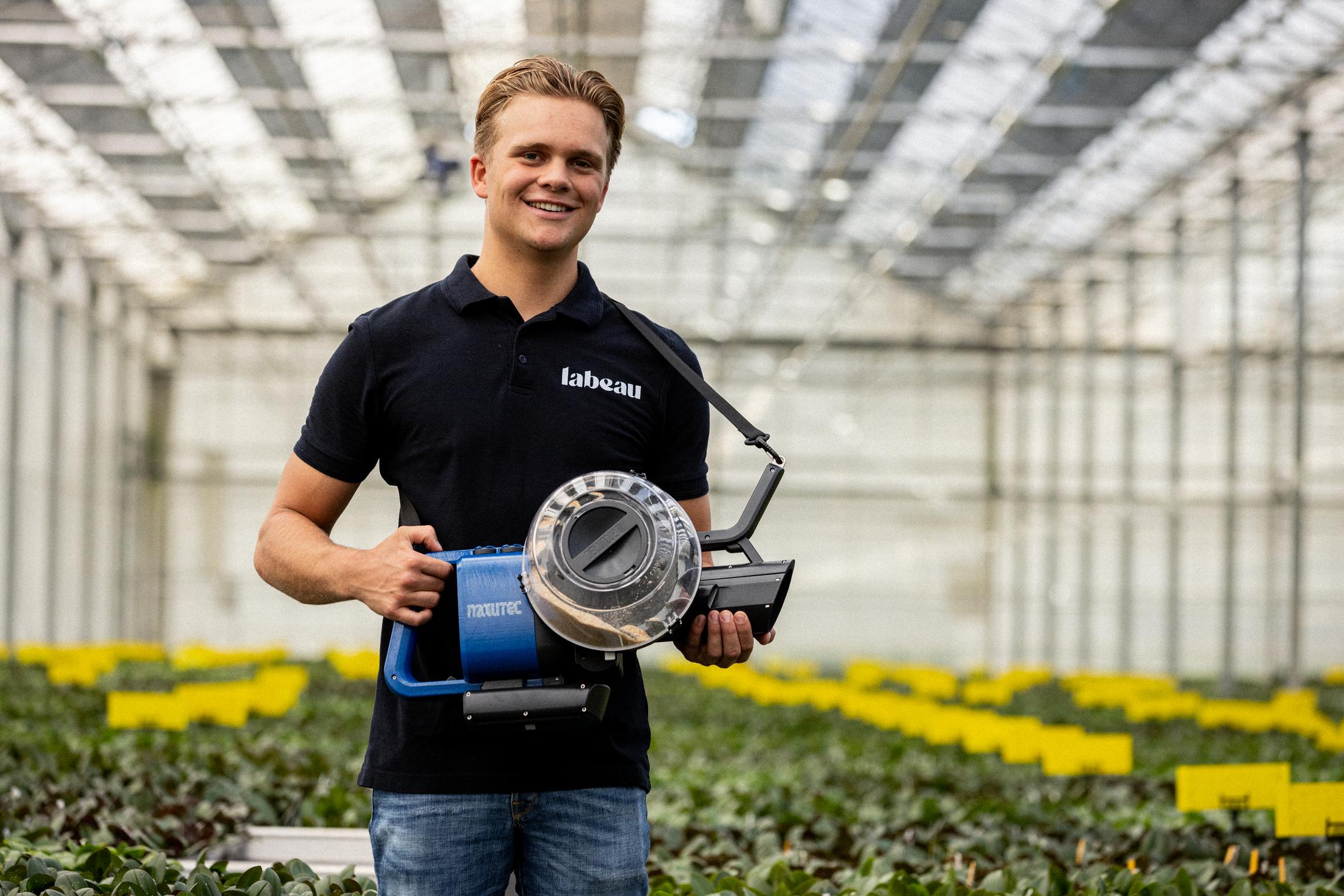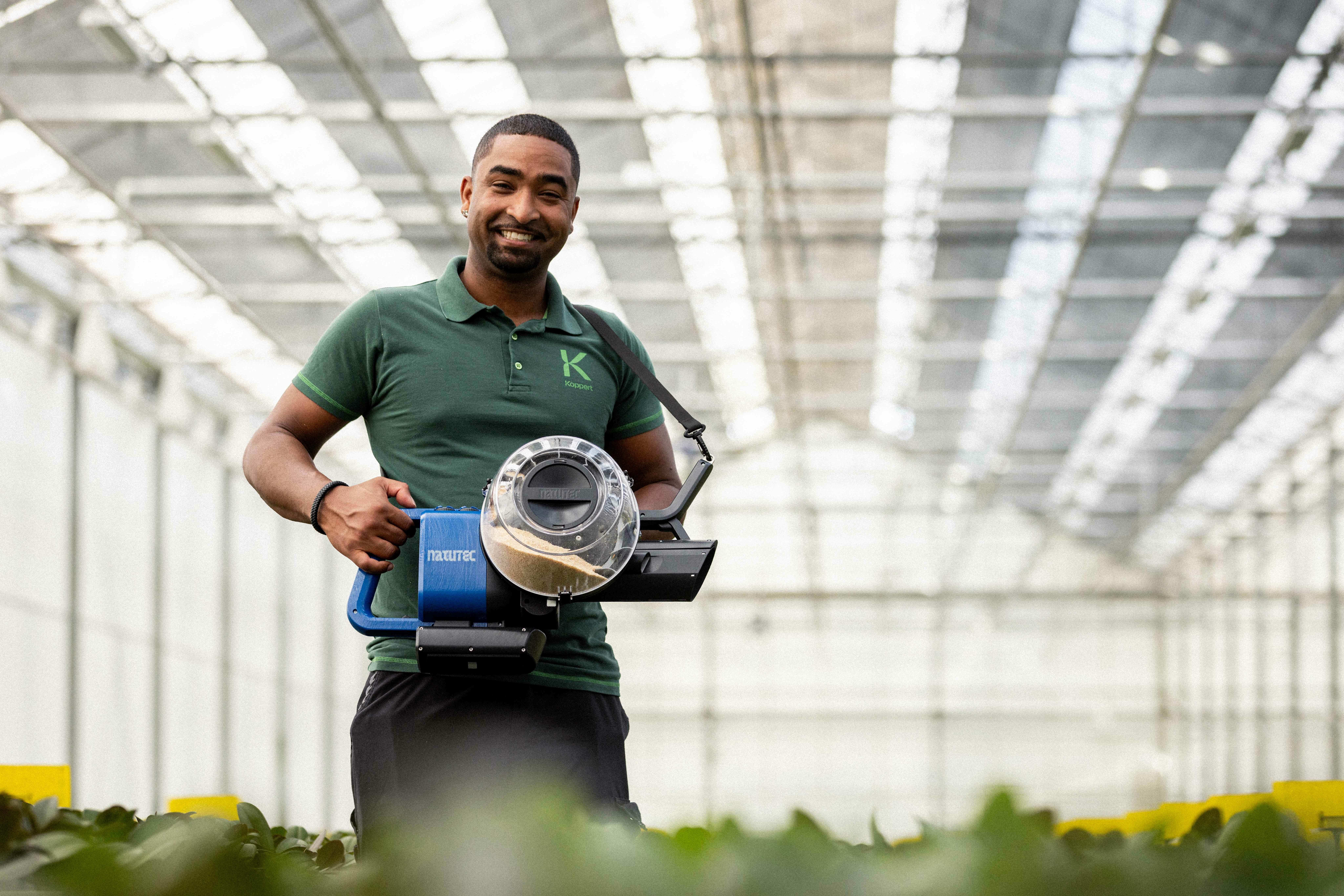 El Airobreez es una sopladora portátil que genera una corriente de aire uniforme para ayudar a dispersar a nuestros insectos benéficos de forma segura en el cultivo. «Nunca habíamos visto a nuestros insectos benéficos llegar a su destino en mejores condiciones ni distribuidos de forma tan uniforme», afirma Maikel van Essen, gerente de producto en Koppert. «Airobreez establece un nuevo estándar en la industria para sopladores manuales, no solo en rendimiento, sino también en facilidad de uso. Al liberar los insectos benéficos mediante una corriente de aire controlada y suave, aseguramos que los organismos lleguen en condiciones óptimas, con tasas de mortalidad inferiores al 2%».