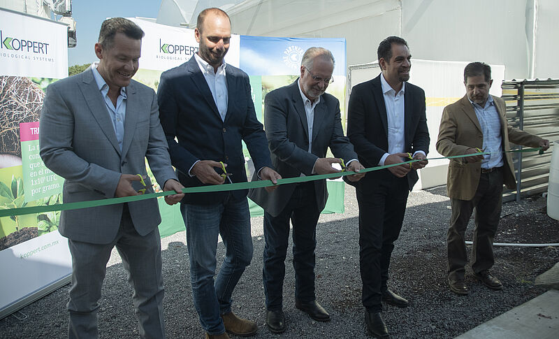 (FOTO, de izquierda a derecha: Ing. Rigoberto Bueno (presidente del Consejo de Koppert México), René Ruiter (director global de la división Horti de Koppert Biological Systems, Ing. Carl Heinz Dobler Mehner (secretario de desarrollo agropecuario del Estado de Querétaro), Dr. Alfonso Torres (director general de Koppert México), Ing. Félix Tarráts (director del CEICKOR y la Universidad CEICKOR) en la inauguración de los invernaderos demostrativo y experimental de Koppert.
