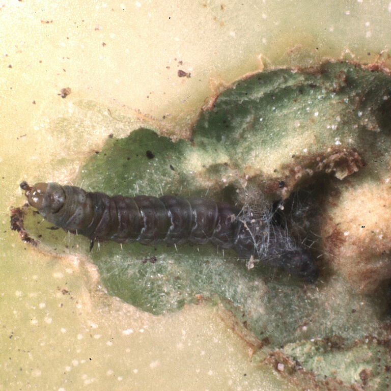 Aunque los daños se puedan observan en los frutos y el follaje, es más importante cuando este ocurre en el fruto. El primero y el segundo estadio larval se alimentan de la hoja como lo haría un minador, produciendo una mancha “minada”. Usualmente, en los siguientes instares doblan las hojas o las pegan entre sí con seda como medio de protección y como sitios de alimentación, aunque también pueden encontrarse en los tallos. La contaminación del fruto ocurre cuando las larvas entran al tomate, dejando su marca característica que le da su nombre, como si una aguja se insertara en el fruto.