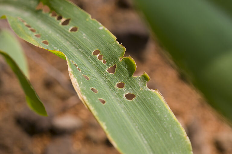 Durante el crecimiento vegetativo del maíz, las larvas se alimentan de las hojas: cuando las orugas son chicas suelen tener comportamiento de trozadoras, y cuando pasan a instares más grandes tienen hábito de defoliadoras.