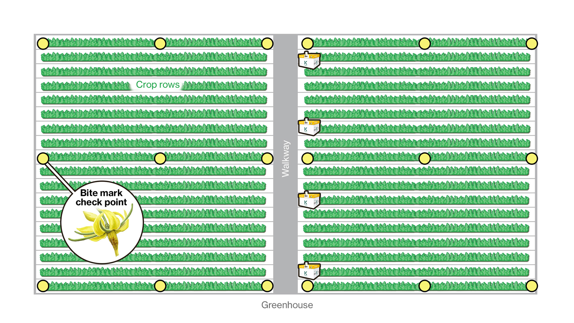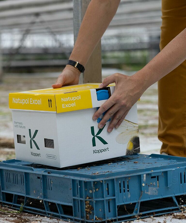 En invierno, elija un lugar donde las colmenas reciban luz solar temprana, normalmente en el lado norte. Si es necesario, las colmenas pueden colocarse más arriba dentro del cultivo, a una altura mínima de 1,4 metros del suelo, sobre todo en zonas de cultivo denso. En los días más oscuros del invierno, considere la posibilidad de colocar las colmenas por encima del cultivo, cerca del tejado del invernadero. Esto permite que los abejorros reciban la máxima luz del día, facilitando su orientación. Para evitar el sobrecalentamiento, procure que las colmenas no estén demasiado cerca de lámparas que generen calor. Además, proteja a los abejorros de la luz directa del sol por la tarde colocando pantallas sobre las colmenas y, en épocas de bajas temperaturas, protéjalos del frío.