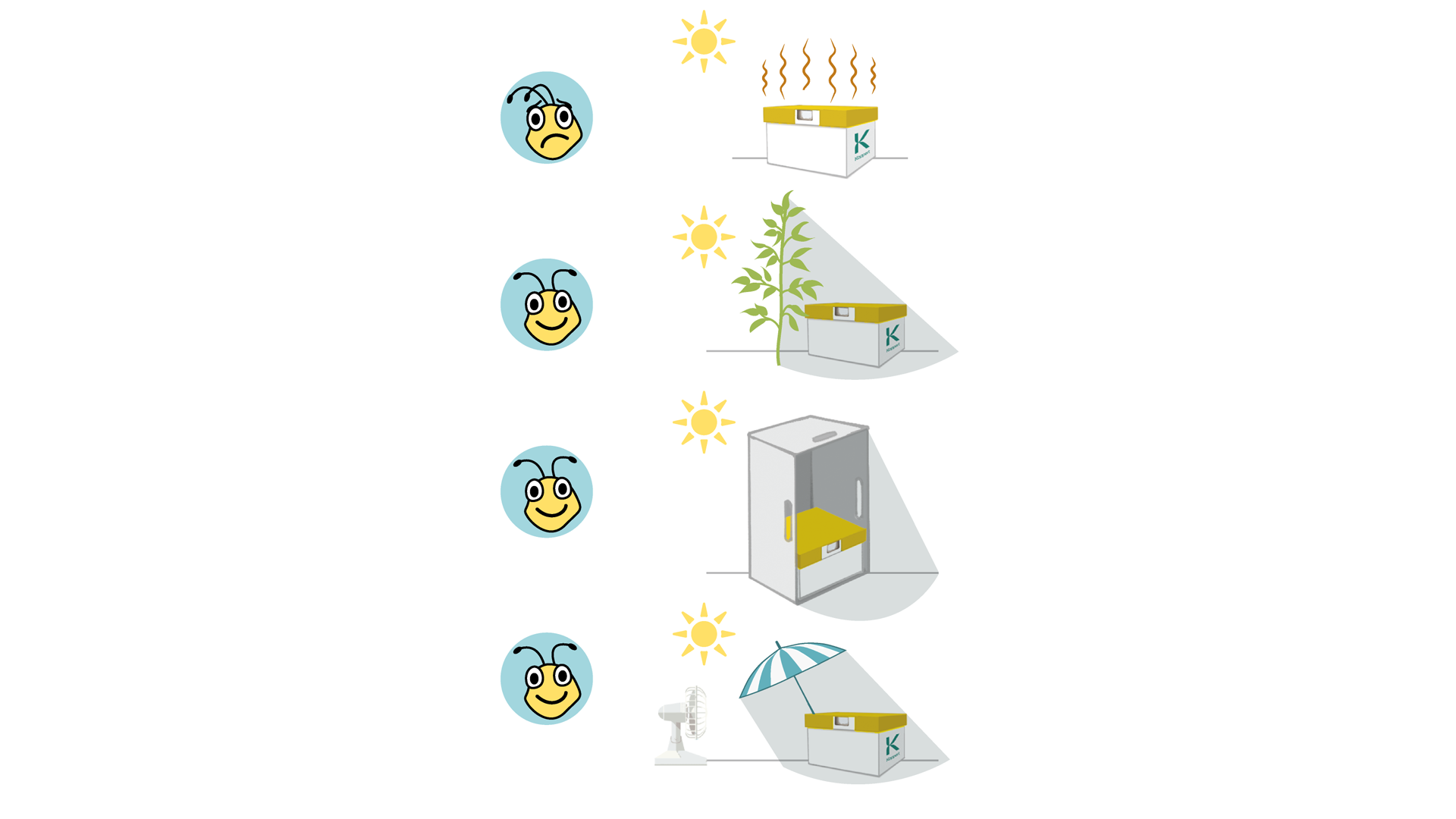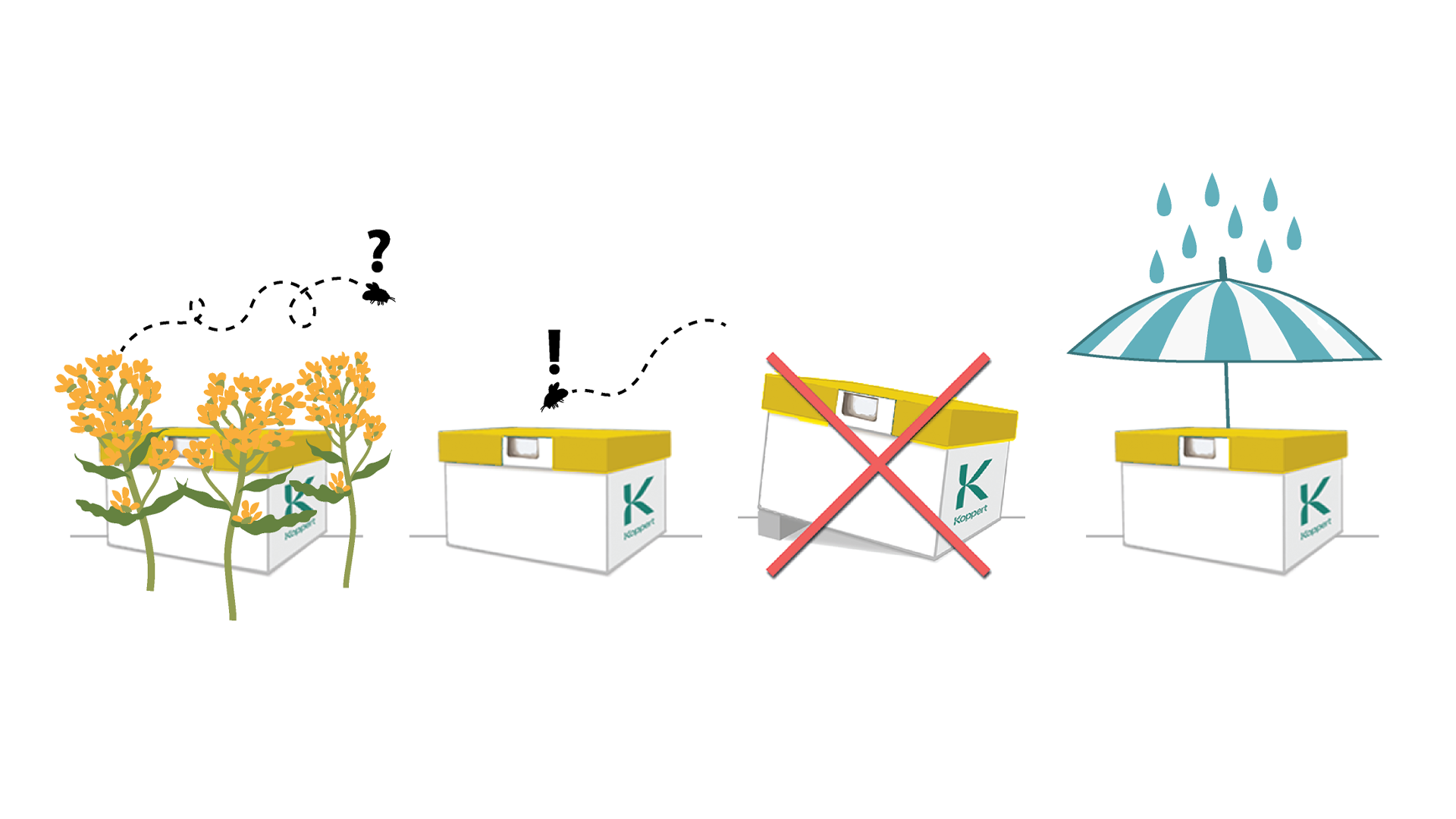 Durante estas estaciones, es aconsejable colocar las colmenas a una altura de entre 20 y 60 cm del suelo, en el lado sur del camino. Esta ubicación garantiza que las colmenas reciban una sombra adecuada durante todo el día. En caso de sombra insuficiente, deben tomarse medidas adicionales, especialmente en otoño, cuando el sistema inalámbrico Beehome está cerrado. En épocas de altas temperaturas, proteja a sus abejorros del calor.