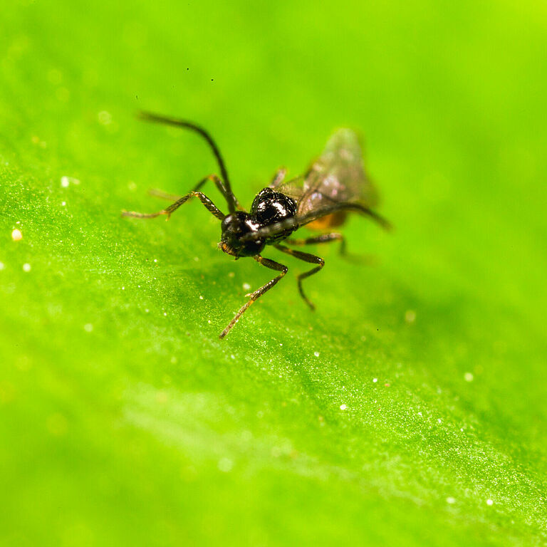 La avispa parasitaria Aphidius matricariae está disponible en frasco (Aphipar-M).