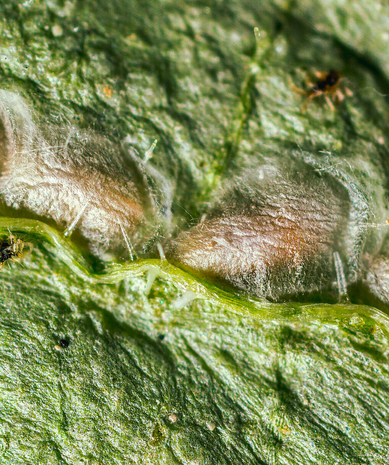 - Pupa: Tras completar su desarrollo larvario, las larvas de Feltiella acarisuga entran en el estadio pupal. Las pupas suelen encontrarse en lugares protegidos, como las grietas de las hojas o dentro del suelo. Al principio tienen un aspecto verde pálido, pero se oscurecen gradualmente a medida que maduran. Las pupas son alargadas y ligeramente curvadas, parecidas a pequeños granos de arroz.