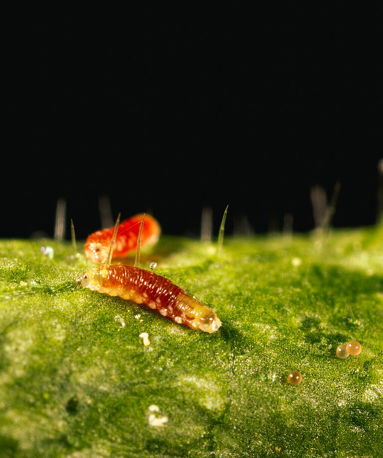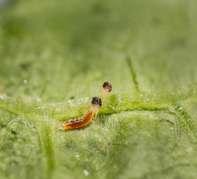 - Larva: El color de la larva suele ser naranja, pero puede variar según el color de la presa ingerida y a veces puede ser amarillo o rojo. Inmediatamente después de salir del huevo, la larva es de color blanco amarillento. Los huevos y los primeros estadios larvarios son muy difíciles de encontrar en el cultivo debido a su pequeño tamaño y coloración.
