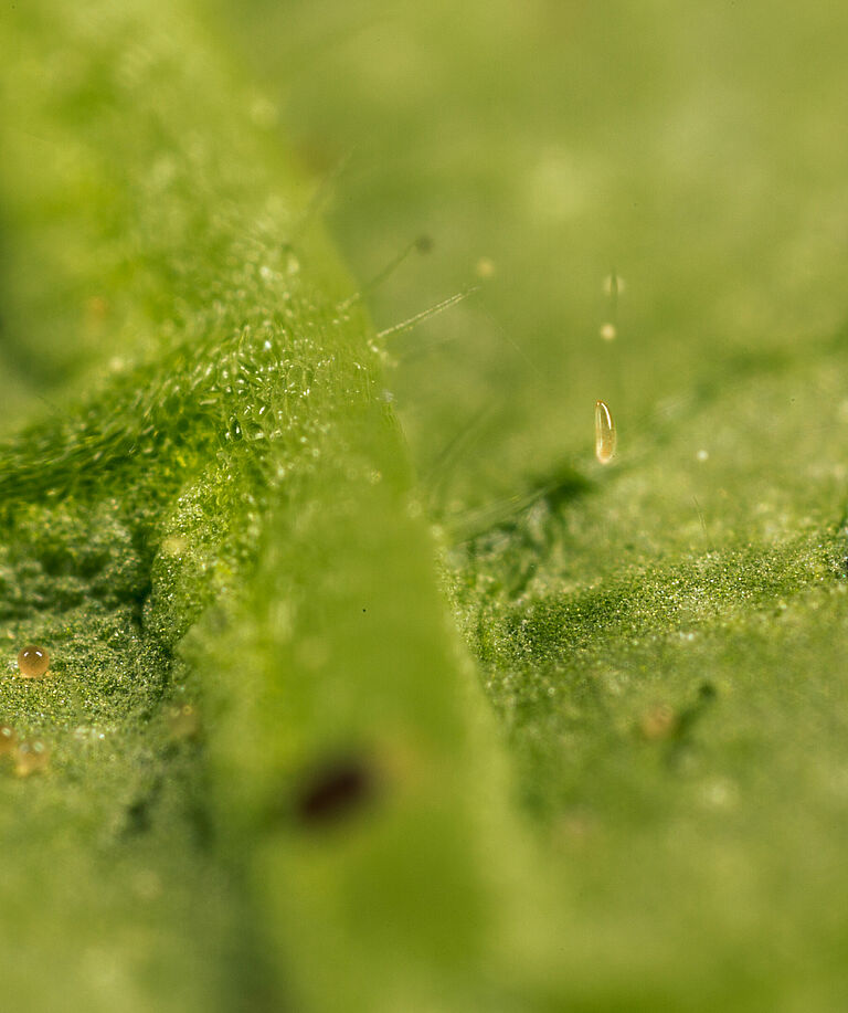 - Adulto: A medida que avanza el desarrollo, aparece una mancha roja en la parte media, tras lo cual toda la larva se oscurece. Finalmente, aparecen manchas blancas en el cuerpo. Una larva completamente desarrollada mide unos 2 mm de largo. Al final del último estadio larvario, la larva hila un capullo blanco cerca de una vena de la hoja y pupa en su interior.
