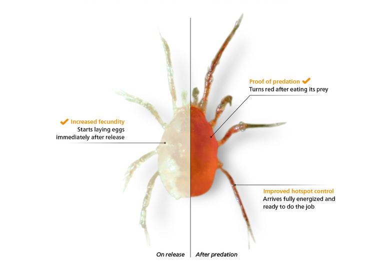 Los ácaros depredadores de Spidex Vital nacen con el objetivo de luchar contra las arañas rojas. Ofrecen un control excelente de focos de infestación, ya que las poblaciones se desarrollan a partir de un crecimiento más rápido, con mayor capacidad de oviposición y con una evidencia clara de depredación. Tras consumir varias arañas rojas, el color nuestro depredador cambia gradualmente al característico color rojo-anaranjado.