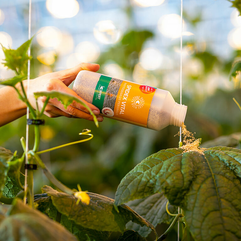 Nuestra fórmula mejorada asegura que nuestros ácaros depredadores empiecen con energía y estén mejor preparados para viajar la distancia requerida. Debido a que las botellas de Spidex Vital contienen una mezcla de población más diversa, cuando se aplica en los focos de infestación, los adultos darán paso a las ninfas en desarrollo y los huevos Spidex presentes también emergerán en medio de la fuente de alimentación adecuada. Esta combinación de factores favorece el control de los focos de infestación en tu cultivo.